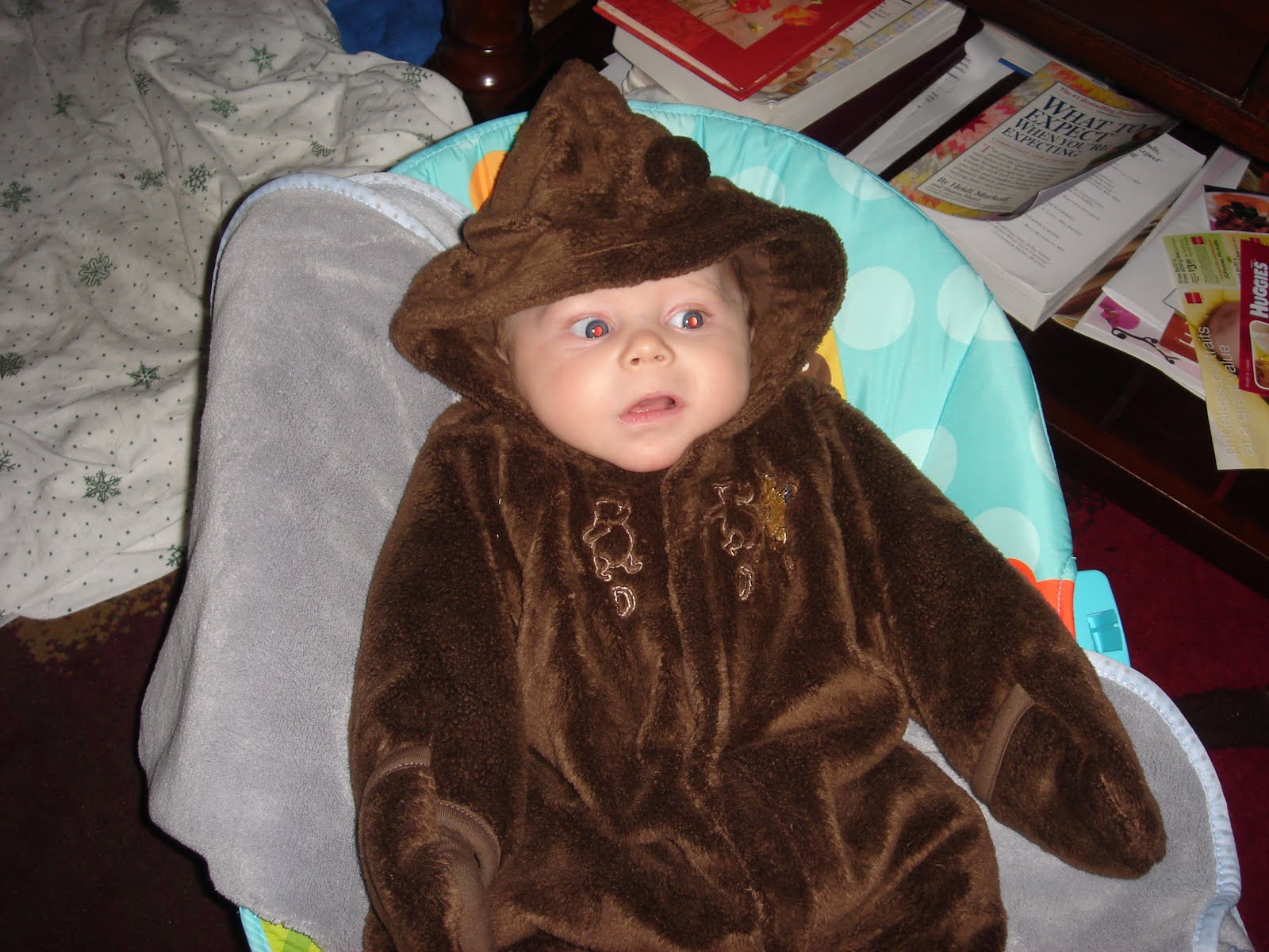So we have this bear suit that someone gave us for Miles before he was born. Ever since Miles was born Dan has been dying to put him in the bear suit, but we've just never had the right occasion to dress him in it. So this morning while I was eating my breakfast, Dan comes in to the living room with Miles in his bear suit! He was so cute I had to post pictures of him!!!